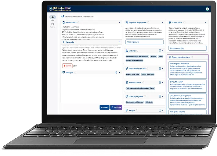O HiDoctor já conta com um módulo de Inteligência Artificial que transcreve automaticamente a consulta, organiza os dados clínicos em tempo real e sugere exames e condutas com base no histórico do paciente. Mais agilidade e precisão, direto no prontuário.